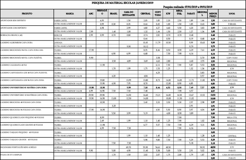A pesquisa divulgada nesta sexta-feira, 11, apresenta o valor mais caro (marcas líderes de mercado) e o mais barato de cada item. A maior variação de preços em produtos de marcas diferentes foi registrada no apontador com depósito, que em um estabelecimento custa R$ 1,00 e em outro R$ 7,99 (699%). Já em produtos da mesma marca, a maior variação foi da borracha branca, o preço vai de R$ 0,48 a R$ 2,99 (523%).
