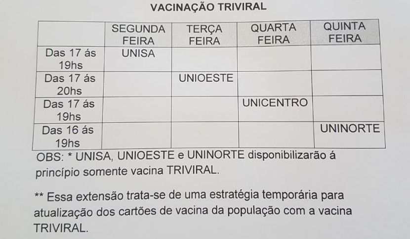 A Responsável Técnica pela Imunização na rede pública, Marcela Silva Mesquita, informa que durante o mês de setembro, o horário de funcionamento das salas de vacina na Uninorte, Unicentro, Unisa e Unioeste será estendido, uma vez por semana, principalmente para atender as pessoas que precisam receber doses da vacina triviral que combate caxumba, sarampo e rubéola.