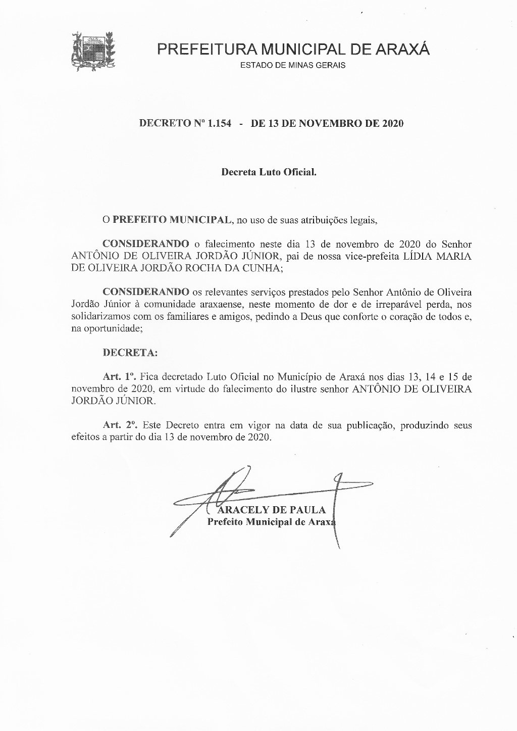 Prefeito Aracely decreta luto oficial de três dias