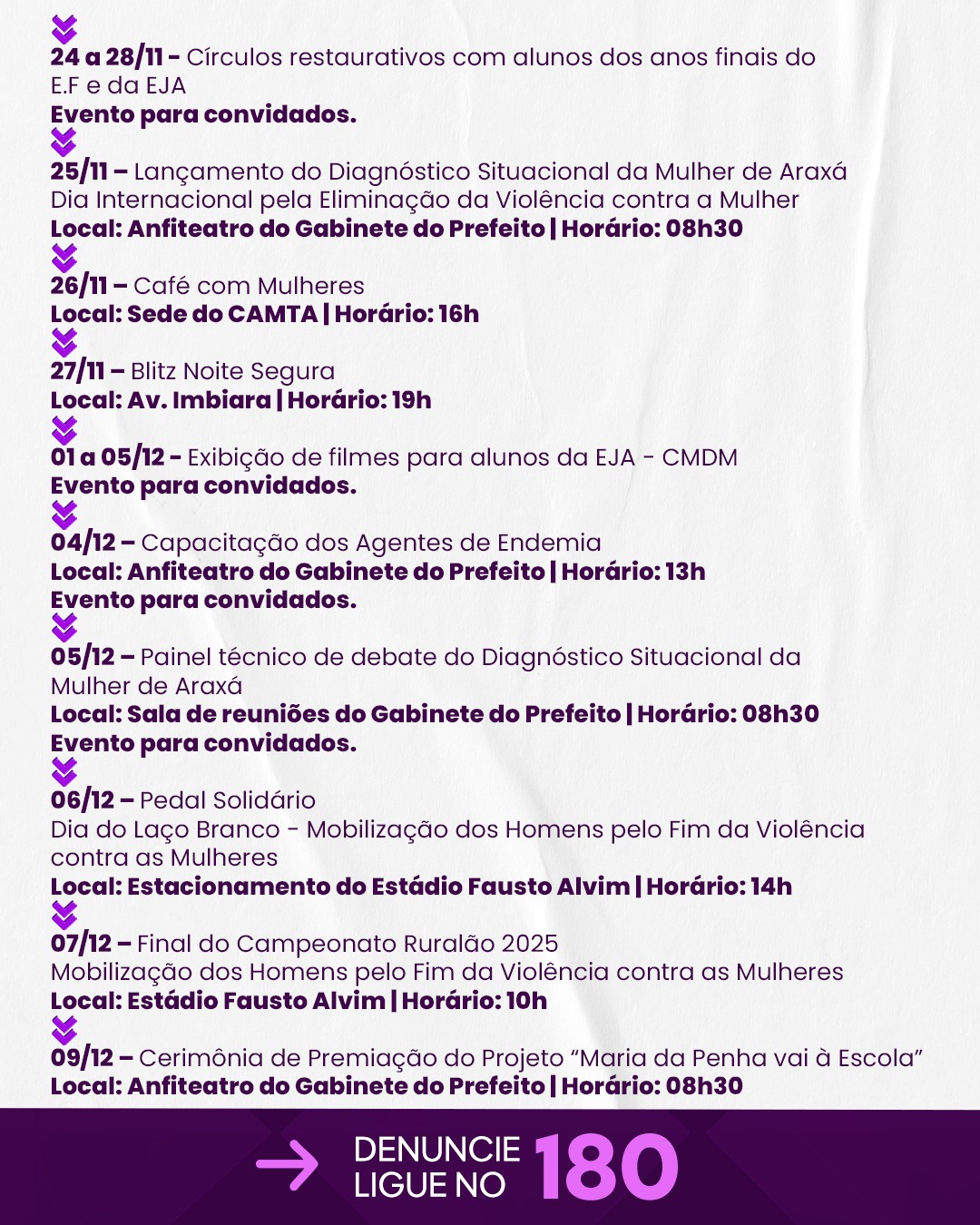 Ao longo dos 21 dias, Araxá contará com ações educativas, preventivas e de mobilização social. Entre os destaques da programação estão: Lançamento do Diagnóstico Municipal da Violência contra a Mulher (25/11), com dados inéditos sobre a realidade local; Premiação do projeto “Maria da Penha vai às Escolas”, que leva prevenção e conhecimento às salas de aula; Blitz “Noite Segura”, reforçando proteção para mulheres em bares e estabelecimentos noturnos; Pedal Solidário, rodas de conversa, ações esportivas, culturais e educativas; Mobilização dos Homens pelo Fim da Violência contra as Mulheres, durante a final do Campeonato Ruralão 2025. A programação foi construída de forma intersetorial, reunindo saúde, educação, assistência social, segurança pública, esporte, cultura e sociedade civil.