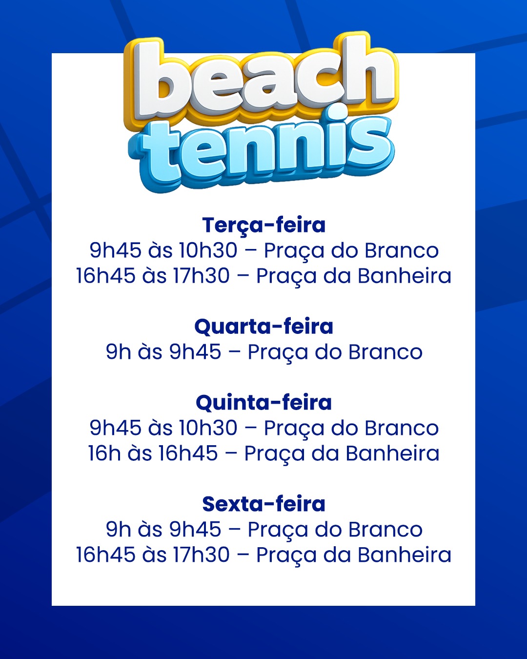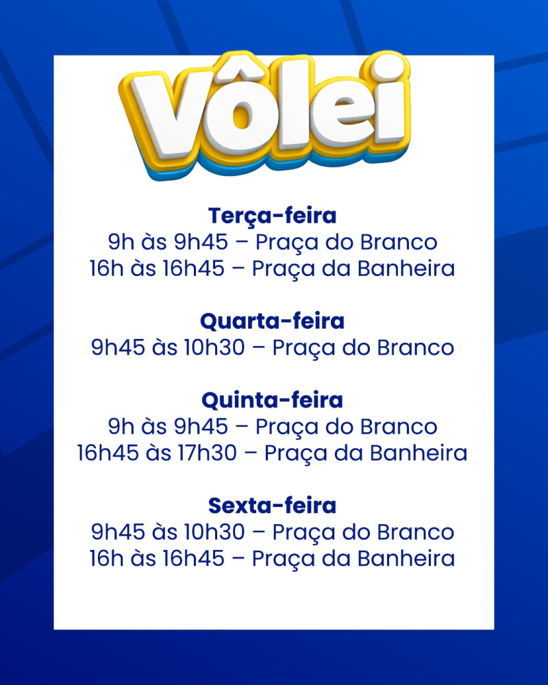 As aulas de vôlei de areia e beach tennis são destinadas a participantes a partir de 12 anos. Todas as turmas contam com até 10 vagas.