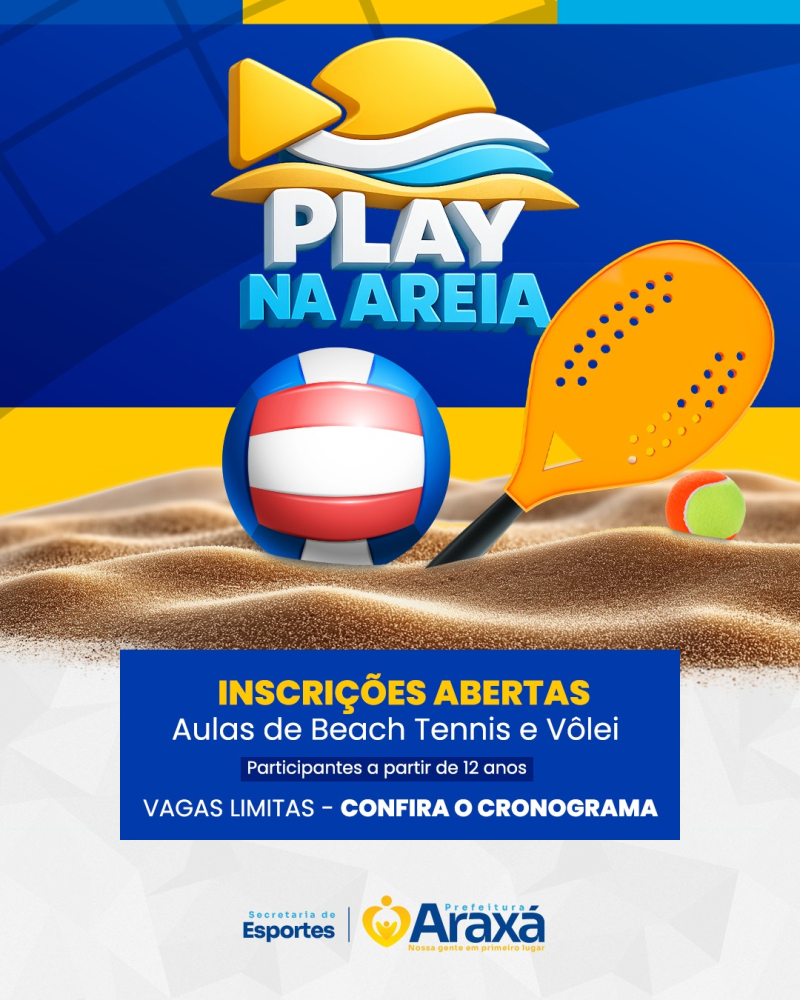 A Prefeitura de Araxá, por meio da Secretaria Municipal de Esportes, está com inscrições abertas para o Projeto Play na Areia, que oferece aulas gratuitas em modalidades como vôlei de areia e beach tennis. A iniciativa amplia as oportunidades de prática esportiva no município, com atividades orientadas e realizadas em diferentes espaços públicos.