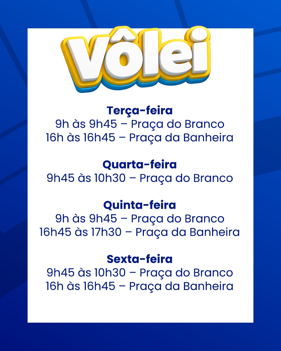 As atividades serão realizadas em diferentes pontos da cidade, como a Praça da Banheira e Praça do Branco, com turmas organizadas por faixa etária e número limitado de vagas.