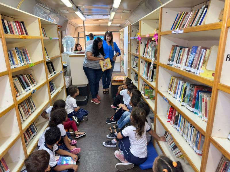 Durante as visitas, os usuários têm livre acesso às estantes e podem escolher até três livros por vez para empréstimo, incentivando o hábito da leitura entre crianças, jovens e adultos.