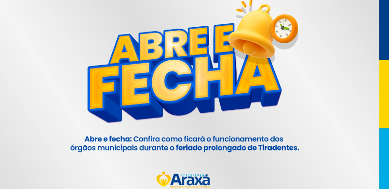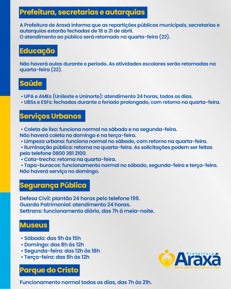 A Prefeitura de Araxá informa que as repartições públicas municipais, secretarias e autarquias estarão fechadas de 18 a 21 de abril.