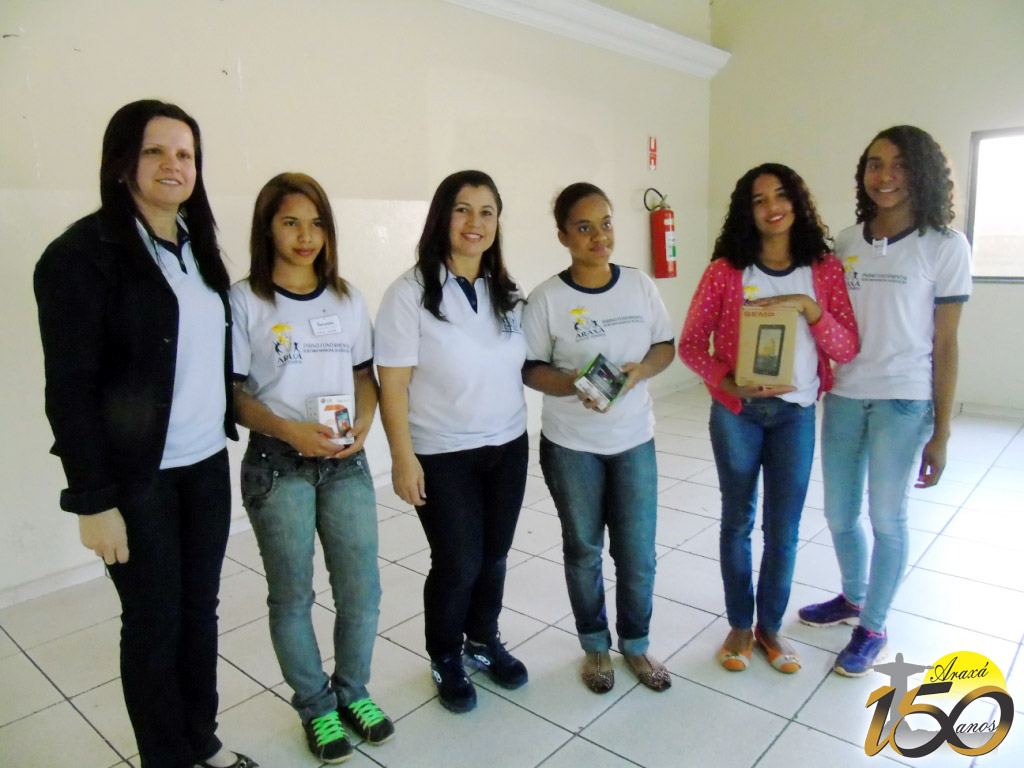 Os alunos vencedores da Olimpíada de Letras foram premiados com um celular (1º lugar de cada disciplina) e um tablet (2º lugar de cada disciplina).