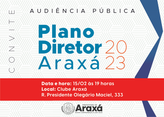 O Instituto de Planejamento e Desenvolvimento de Araxá promove a 2ª Audiência Pública de Revisão do Plano Diretor Estratégico da cidade na próxima quarta-feira (15), a partir das 19h, no Clube Araxá.
