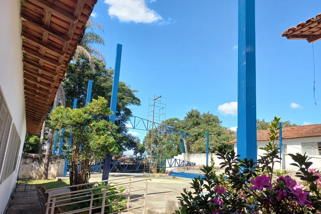A quadra de esportes da Escola Municipal Manoela Lemos, no bairro Urciano Lemos, já está recebendo estrutura para a implantação da nova cobertura. Um temporal havia causado estragos na cobertura anterior, que foi removida.