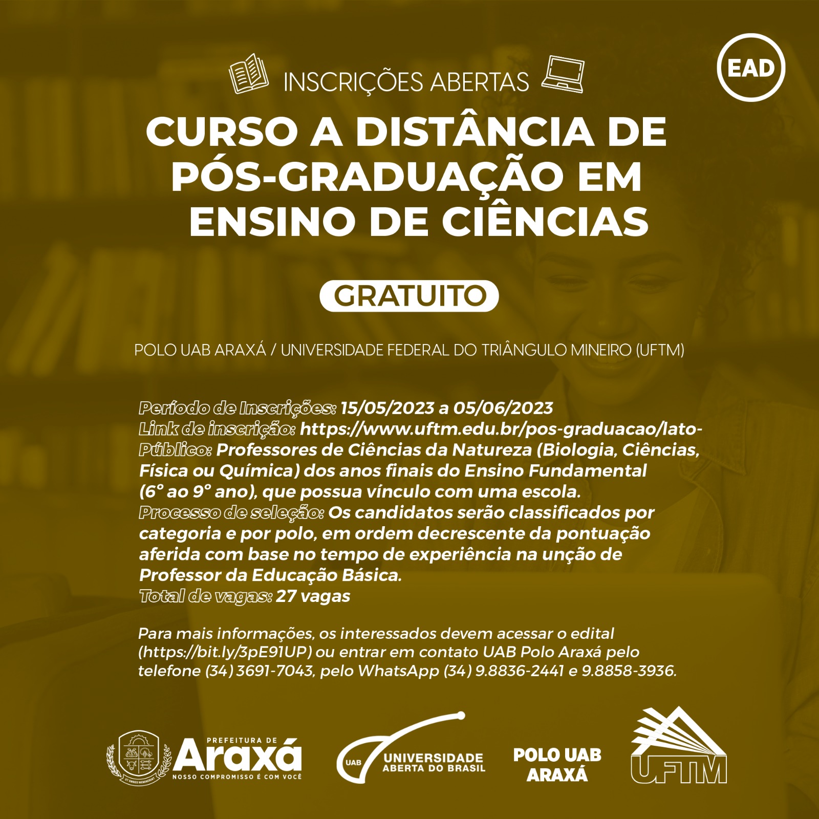 O Polo da Universidade Aberta (UAB) de Araxá oferta vagas para o Curso de Pós-Graduação em Ensino de Ciências - Ciência é 10, voltado para professores dos anos finais do Ensino Fundamental, na modalidade Educação a Distância.