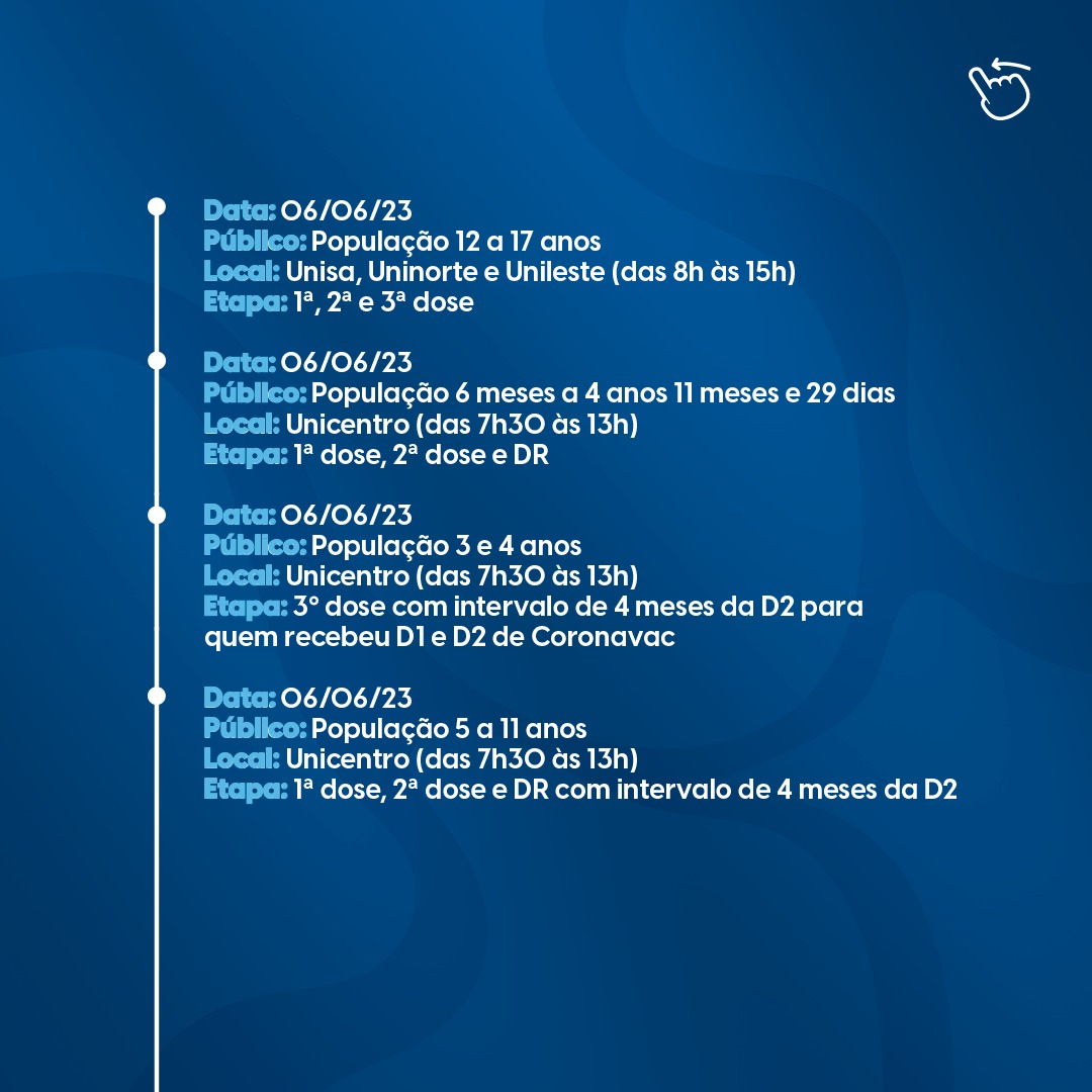 É recomendável a chegada nas primeiras horas do cronograma do dia em função das limitações de doses enviadas pelo Ministério da Saúde e Governo do Estado.
