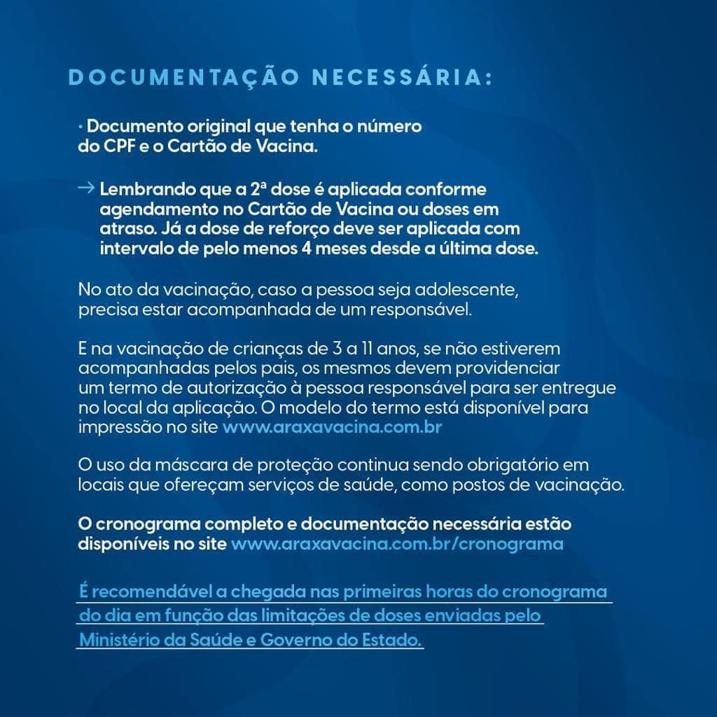E na vacinação de crianças de 3 a 11 anos, se não estiverem acompanhadas pelos pais, os mesmos devem providenciar um termo de autorização à pessoa responsável para ser entregue no local da aplicação. O modelo do termo está disponível para impressão no site ( www.araxavacina.com.br ).