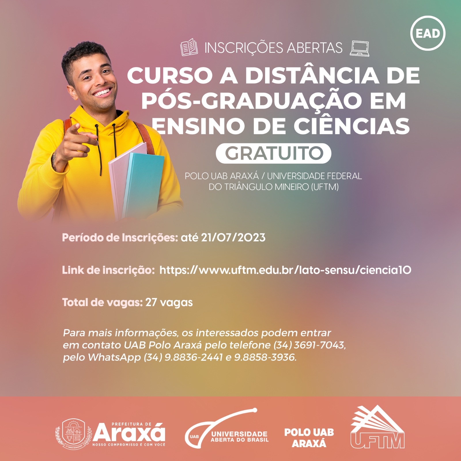 O Polo da Universidade Aberta (UAB) de Araxá oferta vagas para o Curso de Pós-Graduação em Ensino de Ciências - Ciência é 10, na modalidade Educação a Distância. As inscrições são gratuitas e acontecem até o dia 21 de julho, exclusivamente via internet por meio do endereço eletrônico ( https://www.uftm.edu.br/lato-sensu/ciencia10 ).
