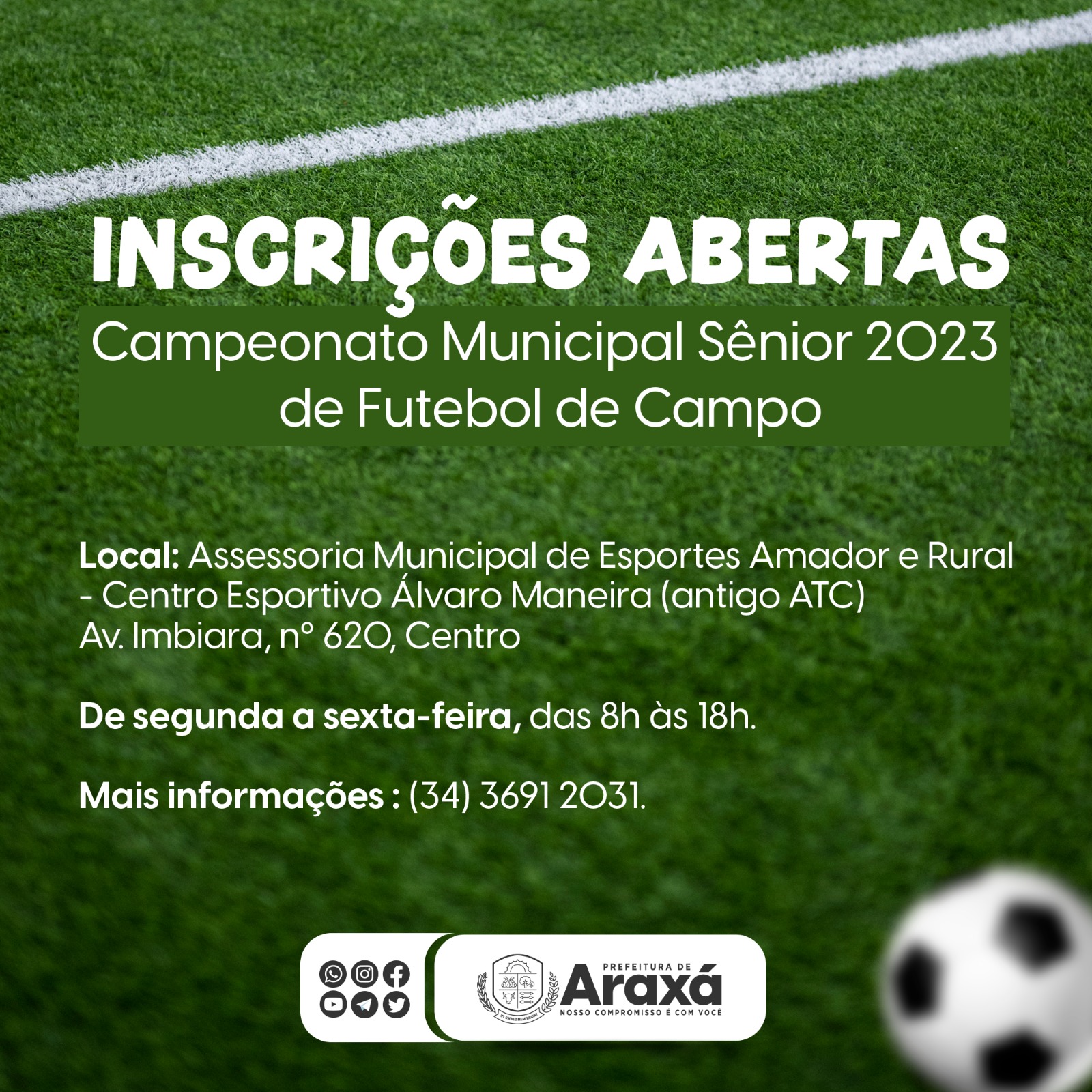 A Secretaria Municipal de Esportes está com inscrições para o 1º Campeonato Municipal Sênior 2023 de Futebol de Campo, organizado pela Assessoria de Esportes Amador e Rural.