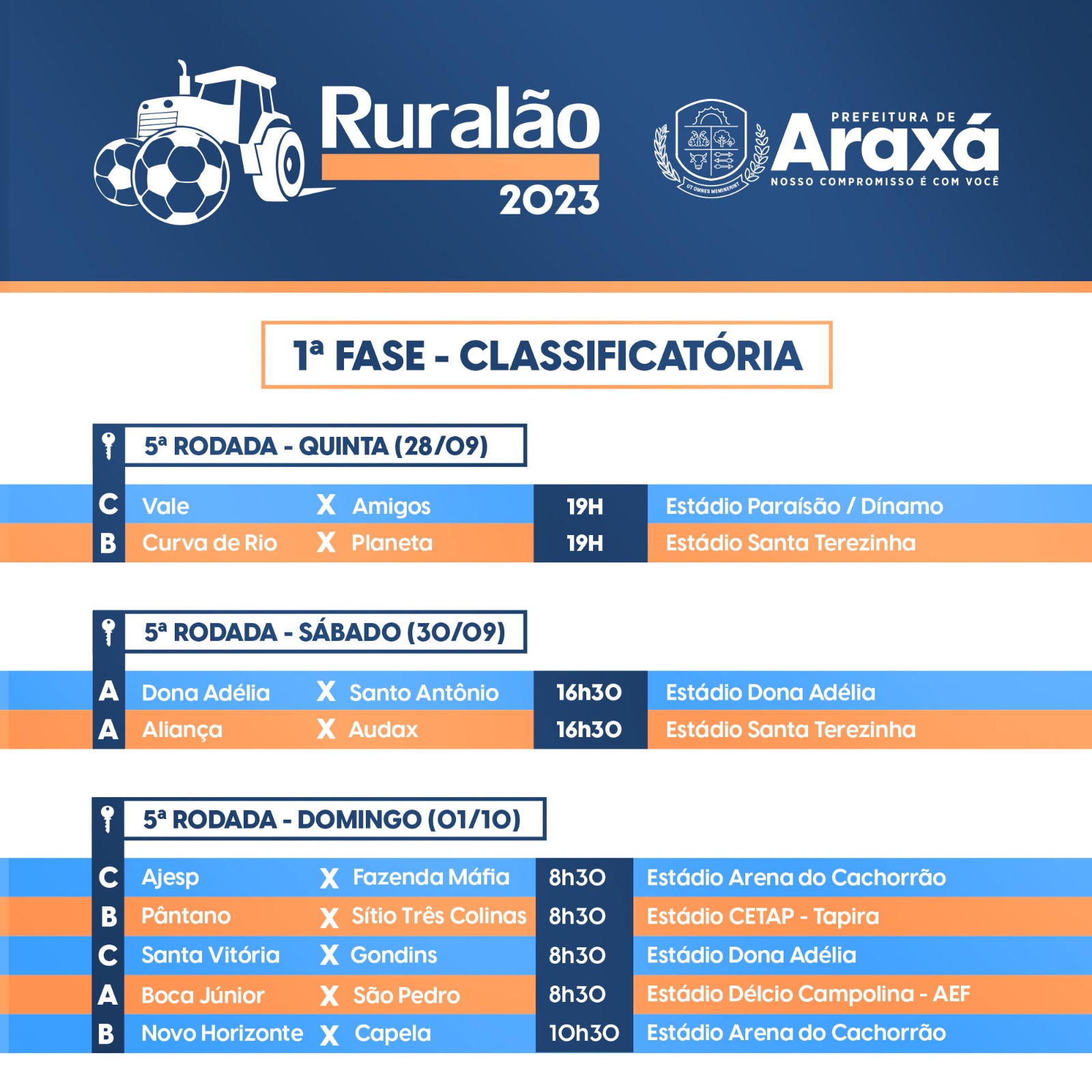 A 5ª rodada do 30º Campeonato Ruralão terá início com duas partidas nesta quinta-feira (28). Curva de Rio e Grêmio Planeta entram em campo, às 19h, no Campo Santa Terezinha. No mesmo horário, Vale E.C e Amigos também se enfrentam, no Campo Paraisão (Dínamo). Os demais jogos acontecem no sábado (30) e domingo (1°).