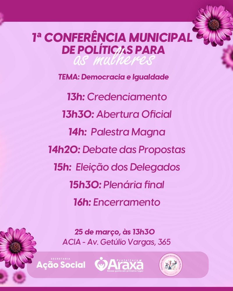 Promovida pelo Conselho Municipal dos Direitos da Mulher (CMDM), a conferência tem o objetivo de definir propostas que serão encaminhadas para a 5ª Conferência Nacional de Políticas para Mulheres, convocada pelo Ministério das Mulheres. Durante o evento, também serão eleitas as sete delegadas que representarão Araxá nas próximas etapas.