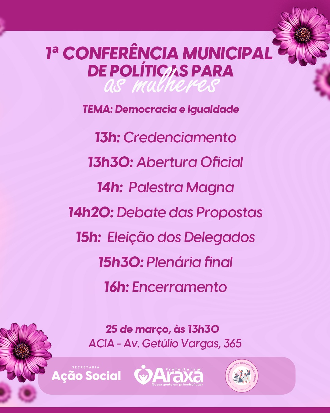 No próximo dia 25 de março, mulheres de Araxá terão um espaço democrático para debater políticas públicas e fortalecer a luta pela igualdade de gênero e ampliação de direitos. A 1ª Conferência Municipal da Mulher será realizada a partir das 13h30, na ACIA (Av. Getúlio Vargas, 365), com o tema “Democracia e Igualdade”.