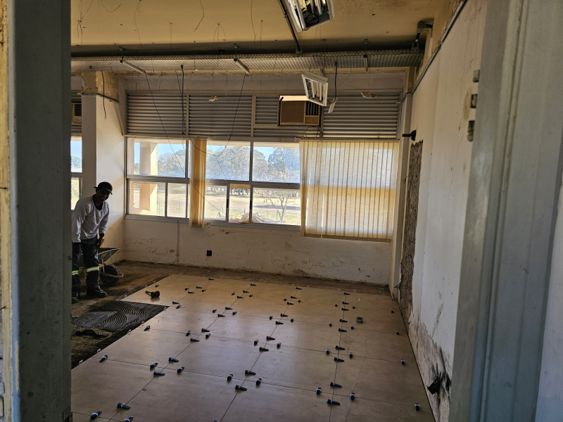 Além da troca completa do piso por porcelanato, a obra inclui reforma do telhado, nova rede elétrica, divisórias em drywall, renovação total dos banheiros (com novos revestimentos, louças e metais), pintura geral e revitalização da fachada.