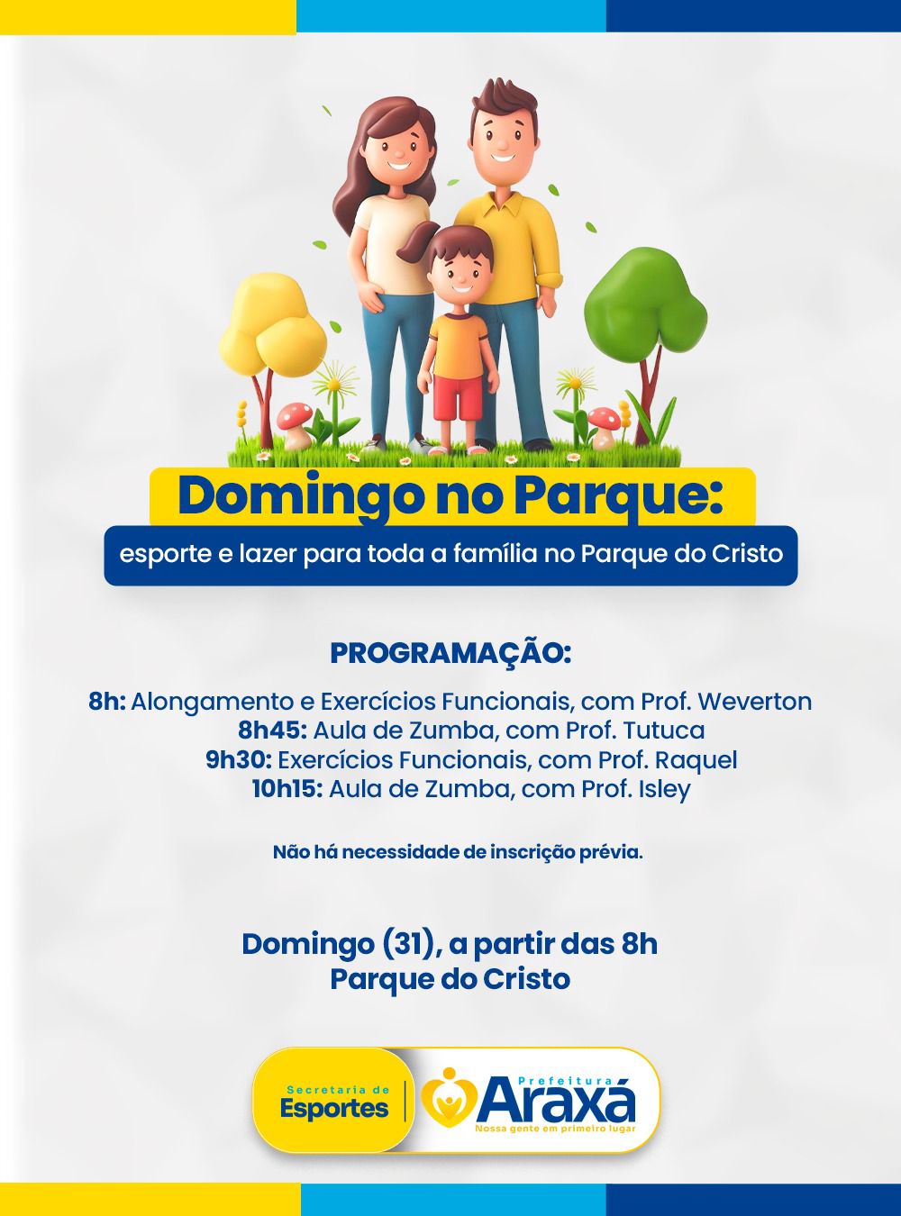 A Prefeitura de Araxá, por meio da Secretaria Municipal de Esportes, realiza a primeira edição do projeto “Domingo no Parque”. Uma manhã de esporte e lazer para toda a família”, no Parque do Cristo, neste domingo (31), a partir das 8h.