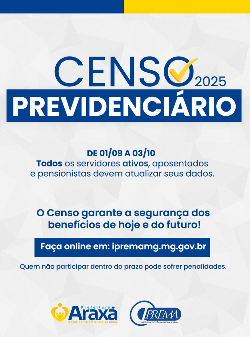O Instituto de Previdência Municipal de Araxá (Iprema) inicia o Censo Previdenciário Cadastral nesta segunda-feira (1º de setembro). O recenseamento envolve todos os servidores públicos municipais efetivos, além de aposentados e pensionistas vinculados ao Regime Próprio de Previdência Social (RPPS). A medida é obrigatória e poderá ser realizada até o próximo dia 3 de outubro. Quem não realizar o procedimento dentro do prazo poderá ter o pagamento do benefício suspenso até a regularização.
