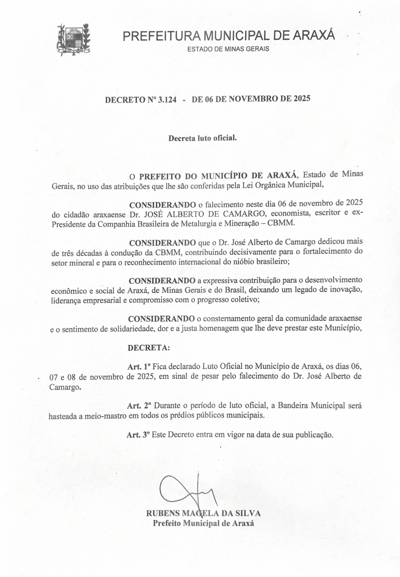 A Prefeitura de Araxá decretou luto oficial de três dias em razão do falecimento do economista, escritor e ex-presidente da Companhia Brasileira de Metalurgia e Mineração (CBMM), José Alberto de Camargo, conhecido como Dr. Camargo, ocorrido na manhã desta quinta-feira (6).