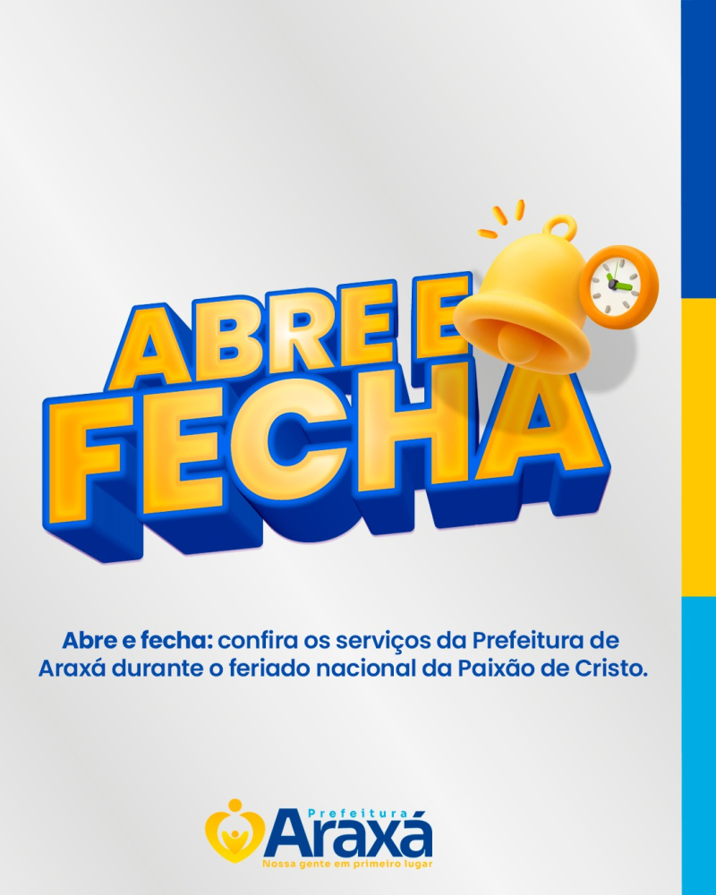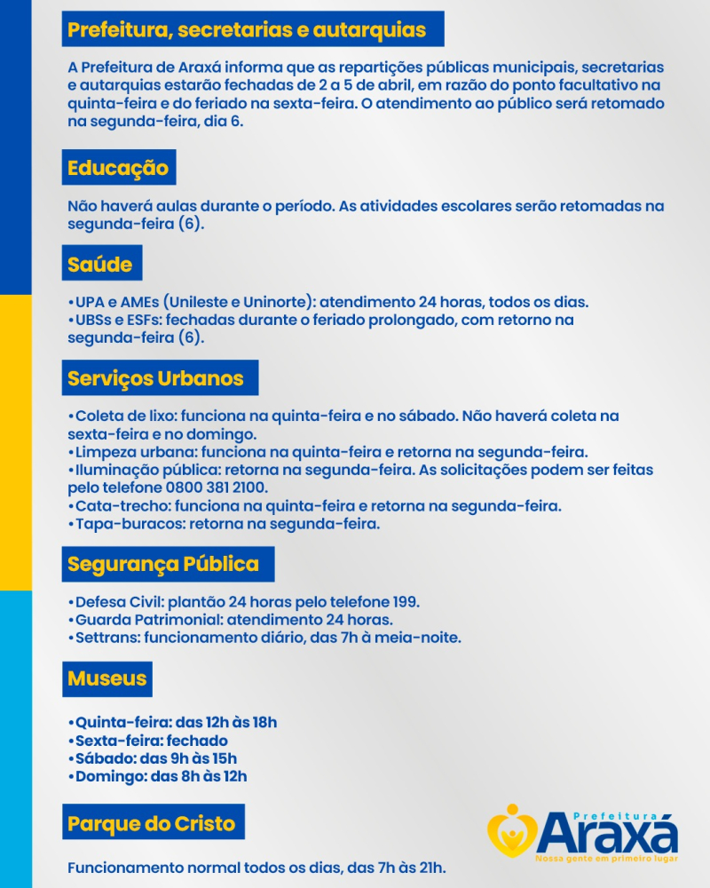 A Prefeitura de Araxá informa que as repartições públicas municipais, secretarias e autarquias estarão fechadas de 2 a 5 de abril, em razão do ponto facultativo na quinta-feira e do feriado na sexta-feira. O atendimento ao público será retomado na segunda-feira, dia 6.