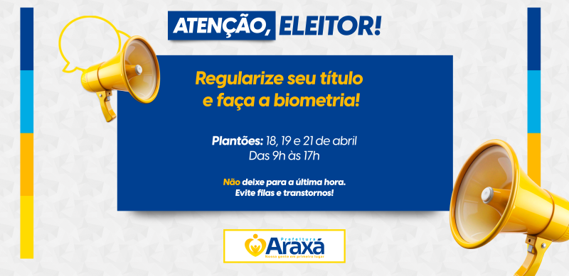 A Justiça Eleitoral de Minas Gerais (TRE-MG) realiza, nos dias 18, 19, 21, 25 e 26 de abril, plantões de atendimento em Araxá para regularização do título de eleitor e coleta de biometria. A ação tem como objetivo facilitar o acesso da população aos serviços eleitorais e garantir que os cidadãos estejam em dia com a Justiça Eleitoral dentro do prazo estabelecido.